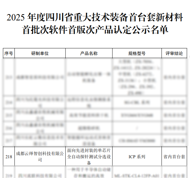 近日,四川省经济和信息化厅官网正式发布《关于2025年度四川省重大技术装备首台套新材料首批次软件首版次产品的公示》,我司凭借硬核自主创新实力成功上榜,自主研发的“面向先进封装的单芯片全自动探针测试分选设备”,荣获“首台套”认定!这不仅是对云绎智创研发实力与核心竞争力的高度认可,更是我们深耕半导体装备领域、践行自主创新使命的有力见证!